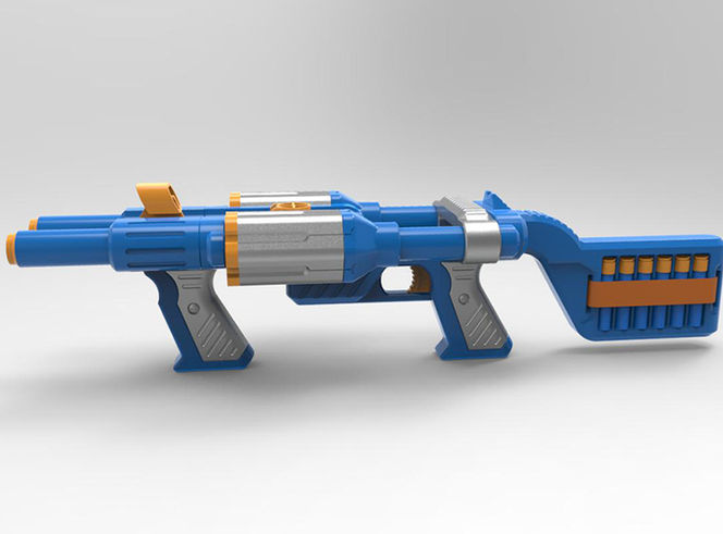 Challenged by a German Toy manufacturer to do something that Nerf hasn’t done was the inspiration behind this system. The base pistol with the twin cylinders transitions with the barrel extension and the added stock.
